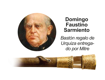 No está muy claro si fue un regalo de un traficante u obsequio de su padre, o lo compró en una barata. Belgrano lo entregaría como ofrenda en medio de una gran procesión a la Virgen de las Mercedes el 24 de septiembre de 1812 tras ganar su primera gran batalla en Tucumán, robándose el protagonismo del evento. Puede que esté de más aclarar que las mujeres de esa época se volvieron locas; ya que fueron ellas las primeras en comprender la carga simbólica de este hecho. Pero ese fue sólo el puntapié inicial de las historias de bastones en Argentina. Sarmiento usaba uno hecho de una viga de la casa de Juan Manuel de Rosas; un botín de guerra. Todos los sobrevivientes de la Batalla de Caseros tenían uno. En 1868 (12 de octubre) Domingo Faustino recibía la posta del gobierno argentino de manos de su ex gran amigo: Mitre (Bartolomé). Mitre organizó para Sarmiento una ceremonia deplorable, libre de todo protocolo y civilización, con el único propósito de arruinarle el día al sanjuanino. Su otro amigo, Justo José de Urquiza, le mandó a hacer un bastón de hueso de 86,5 centímetros, con empuñadura de cristal de roca y oro cincelado, que Mitre entregó de mala gana a Sarmiento el día de la asunción tras un apretón de manos.
