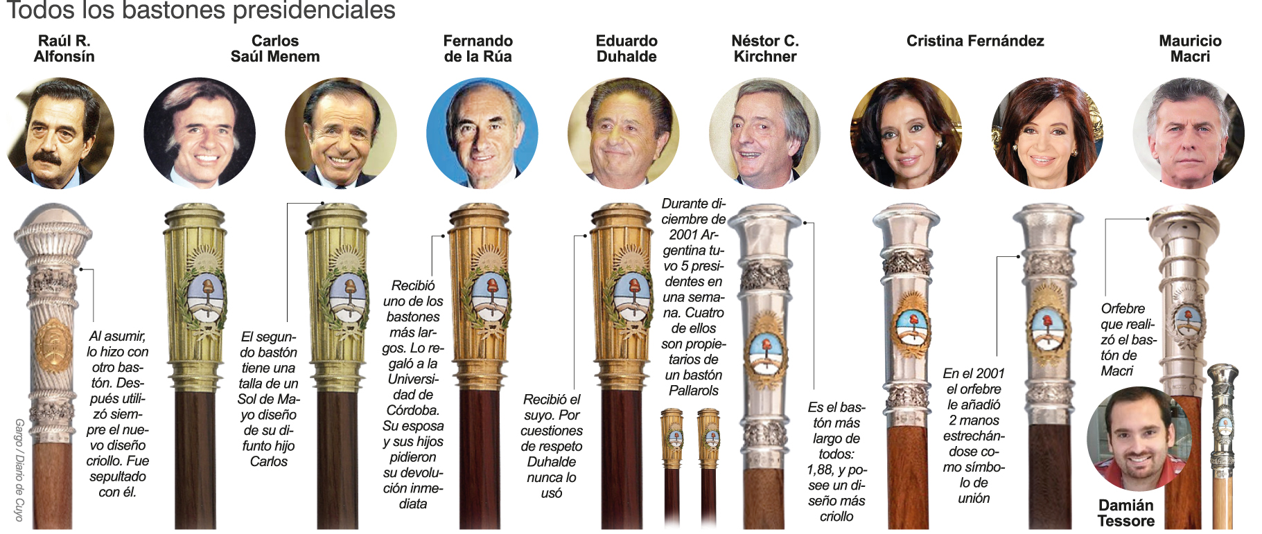 Más de un millón de personas de todo el país lo habían tocado, pero fue la caricia de una presidenta saliente la que desató el infierno. Ese año se hicieron tres bastones para el presidente Macri. El primero elaborado por Pallarols que tenía las Islas Malvinas talladas en el mango y aquel embrujo maligno (según los medios). Un segundo bastón que habría sido encargado por el Santo Padre (Francisco) a Pallarols hijo (Adrián) pero esto nunca se confirmó. Un problema interno se había desatado dentro del núcleo familiar Pallarols que se terminó por enfriar cuando apareció: “El tercero”, que fue realizado por Damián Tessore, de la joyería Eloy, en un intento por quitarle el negocio histórico al viejo. Macri, tras acusar implícitamente a una presidenta de bruja, le cerró la puerta a los Pallarols. Así, él fue el primero en recibir un bastón de otro orfebre desde 1983. Por eso, en esta ceremonia de asunción, habrá más bastones que nunca, ya que Cristina es también la poseedora de tres de ellos. Dos son propios y el tercero, de Néstor Kirchner. Nuestra historia termina donde terminan los bastones: estos son recuperados y coleccionados por el museo de la Casa Rosada. El paso del tiempo y las historias a su alrededor hacen que las recuperaciones sean caras; Alfonsín fue sepultado con su bastón, su recuperación no es posible; así que hay que pedir una réplica pagando esta vez un precio encarecido por el patrimonio cultural perdido. Estas réplicas ya se pueden ver en el museo Pallarols.