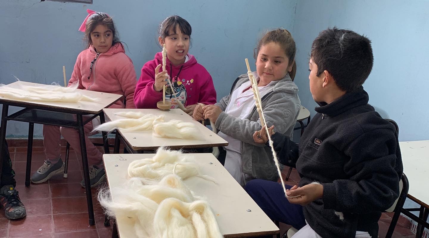 María Eugenia Alba -más conocida como Euge la que teje- y Pablo Martín Pulido llevan años compartiendo experiencias ligadas al tejido. Juntos han participado, dictado y aprendido en talleres y cursos; han sido convocados o han armado exposiciones; han coincidido en espacios en los que el telar es la mejor excusa para reencontrarse con amigos tan apasionados por este arte como ellos. Además están en sintonía en la generosa visión que promueve enseñar a otros para que no se pierda este tradicional estilo de tejido. Por todo eso fue que ni bien se lanzó la primera convocatoria impulsada por la Ley de Mecenazgo en la provincia -en el 2022 (ver recuadro Un entramado con beneficios)- se anotaron para poder llevar vellón de oveja y también lana, husos, cacharros y una garrafa, aparte de ramas, flores y desechos de verdulería y por supuesto telares de peine y absolutamente todos sus saberes y secretos a tres rincones del departamento 25 de Mayo.