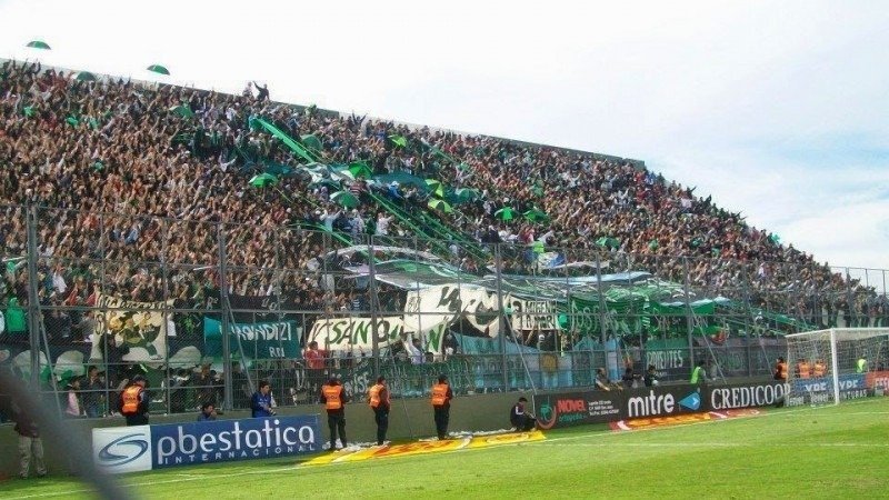 A la izquierda, el plantel que ascendió a Primera División del fútbol argentino en el 2011. A la derecha la popular del estadio verdinegro con su hinchada.