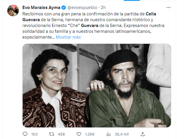 Por su parte, el expresidente de Bolivia, Evo Morales, expresó en su cuenta de Twitter: "Recibimos con una gran pena la confirmación de la partida de Celia Guevara de la Serna, hermana de nuestro comandante histórico y revolucionario Ernesto "Che" Guevara de la Serna".