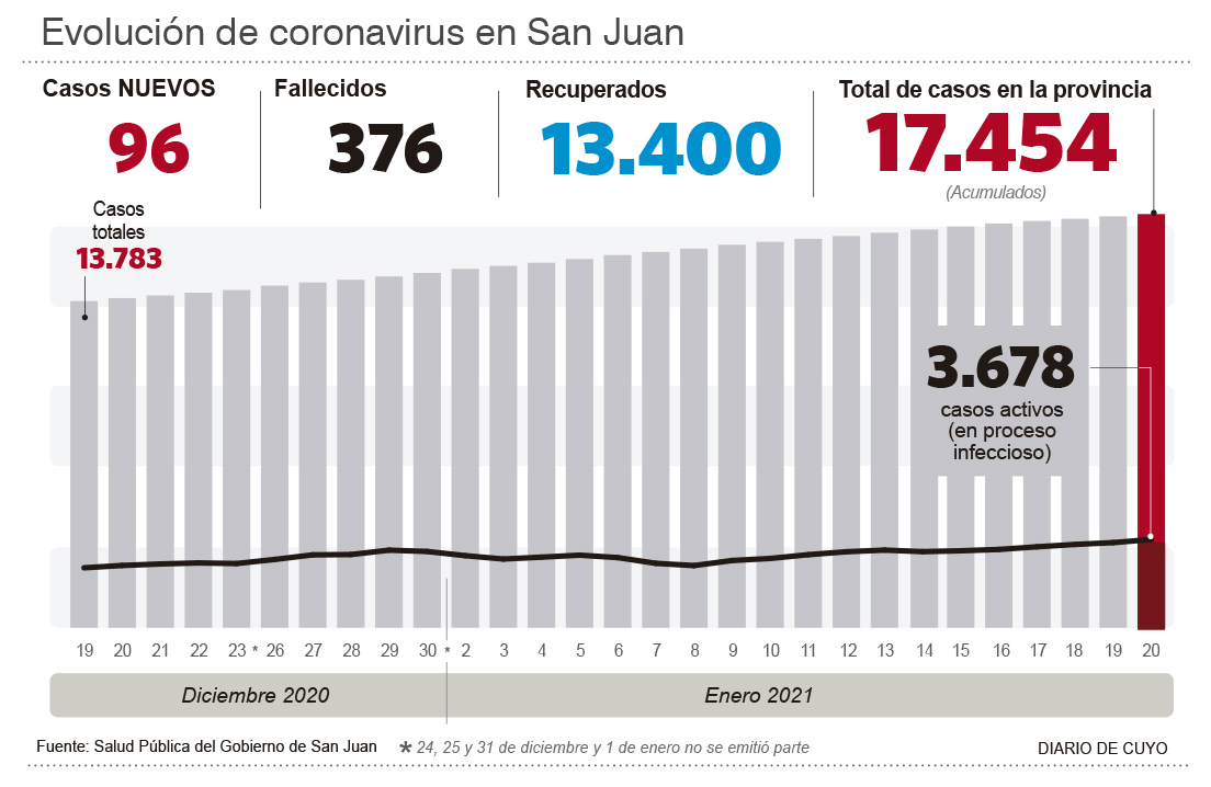 Ayer además se informó del fallecimiento de otras cuatro personas por Covid en la provincia. Se trata de cuatro hombres: dos de Rawson (de 72 y 62 años), uno de Chimbas (75 años) y uno de Rivadavia (73 años). Con ellos, el total de fallecidos en la provincia ya asciende a 376.