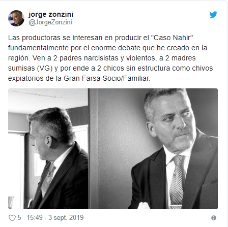 “Las productoras se interesan en producir el “Caso Nahir” fundamentalmente por el enorme debate que he creado en la región. Ven a 2 padres narcisistas y violentos, a 2 madres sumisas y por ende a 2 chicos sin estructura como chivos expiatorios de la Gran Farsa Socio/Familiar”, escribió en la red social del pajarito.