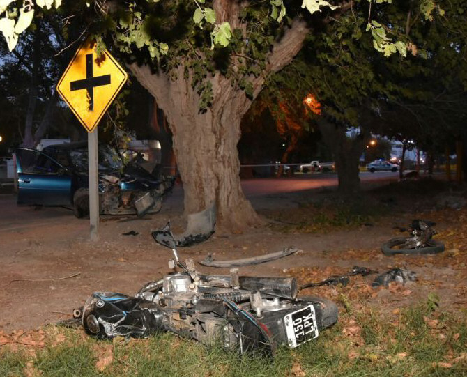 El conductor de un Chevrolet Corsa y un motociclista terminaron alrededor de las 17 de ayer al borde de lo peor, luego de protagonizar un violento choque en Roque Sáenz Peña metros al Oeste de Balcarce, en Santa Lucía. La versión policial es que el chofer del auto, por alguna razón, perdió el control, se cruzó hacia el carril del conductor de una Motomel 150 cc y lo embistió, para luego estrellarse contra un árbol. Tan imprevisto y fuerte fue el impacto, que la moto acabó partida en dos.