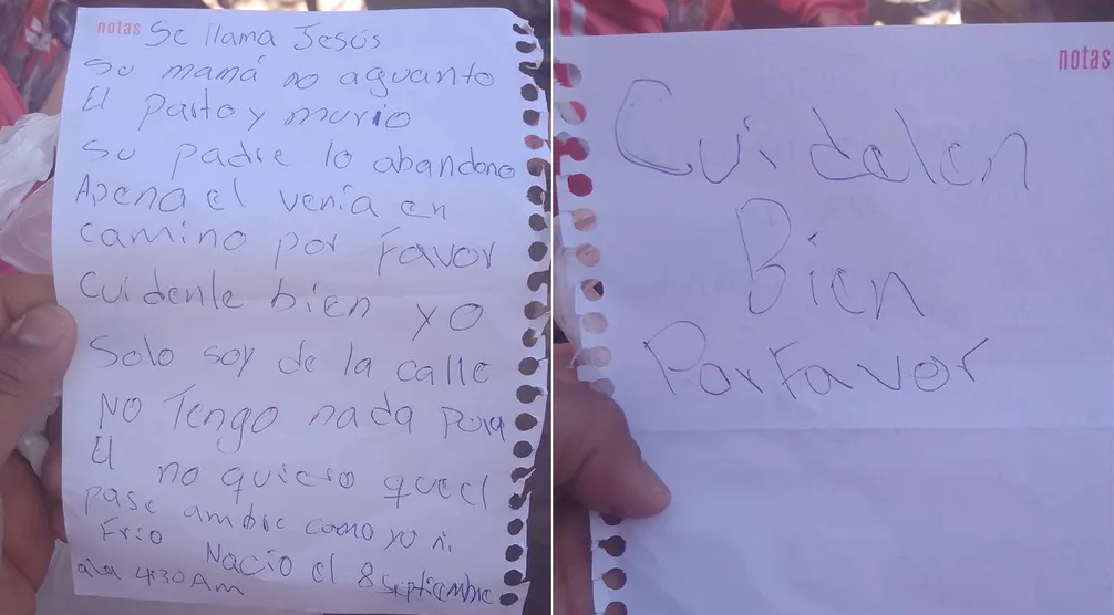 Cuando levantaron al bebé encontraron una carta entre las pocas pertenencias en las que lo habían envuelto: “Se llama Jesús. Su mamá no aguantó el parto y murió. Su padre lo abandonó apenas él venía en camino. Por favor, cuídenlo bien, yo solo soy de la calle y no tengo nada para él. No quiero que él pase hambre como yo ni frío. Nació el 8 de septiembre a las 04:30 am. Cuídenlo bien, por favor”.