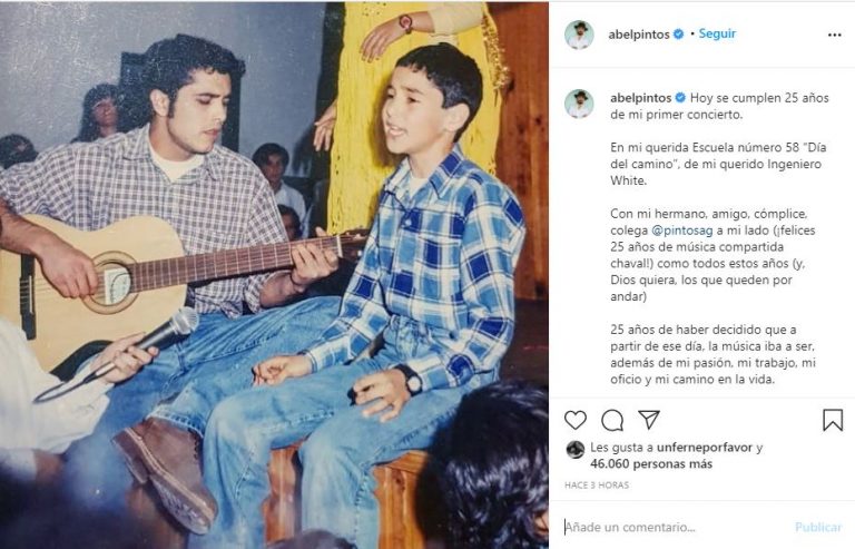 “Hoy se cumplen 25 años de mi primer concierto. En mi querida Escuela número 58 “Día del camino”, de mi querido Ingeniero White. Con mi hermano, amigo, cómplice, colega @pintosag a mi lado (¡felices 25 años de música compartida chaval!) como todos estos años (y, Dios quiera, los que queden por andar) 25 años de haber decidido que a partir de ese día, la música iba a ser, además de mi pasión, mi trabajo, mi oficio y mi camino en la vida. Siento la misma pasión, el mismo amor y el mismo respeto por esta alegría, privilegio y bendición que Dios me da cada día y que ustedes acompañan con tanta consideración. 25 años de gracias a tod@s y cada un@ de l@s que me apoyaron de alguna u otra manera. Con todo mi corazón. 25 años de gracias. Nos vemos en la música ♥️”, escribió Abel Pintos.