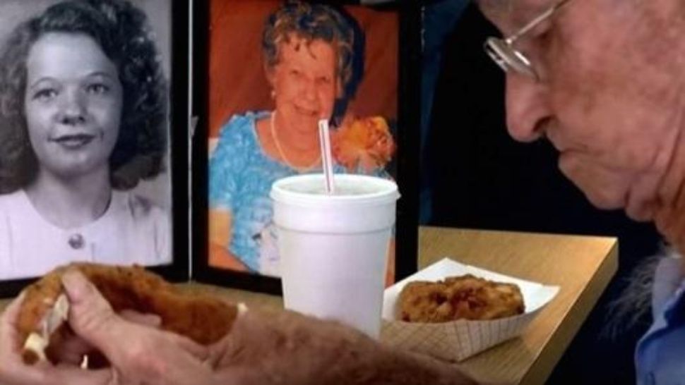 En un lugar de comida rápida, un hombre mayor de edad decidió sentarse a comer acompañado por la fotografía de su esposa fallecida.Testigos del emotivo hecho tomaron fotos al anciano que no podía parar de observar, con infinita tristeza, a su ex mujer mientras intentaba saborear su comida.
