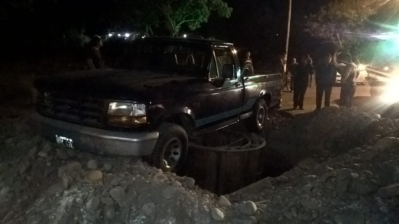 Un lector envió un mensaje y el siguiente comentario: "Esta camioneta terminó en una zanja NO señalizada de una obra de cloacas ubicada en calle Soldado Argentino y José Aguilera, en Rivadavia. Estos sucedió a las 22 del viernes".