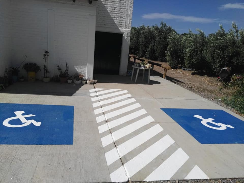 Entre el 2017 y el 2018 las acciones estuvieron puestas en el circuito exterior y un estacionamiento acorde a los requerimientos, esto significa que debe estar lo más próximo posible al acceso principal para evitar grandes traslados y que debe tener lugar suficiente como para que al abrir la puerta del auto, el equipamiento (como sillas de ruedas) no se golpee con otro vehículo o tengan las dimensiones para poder moverse con facilidad, entre otras medidas estandarizadas por la normativa vigente. "Esto nos habilitó a que llegue una persona con discapacidad motriz, descienda del auto y pueda hacer el circuito sin necesitar asistencia. A fines 2019 y principios del 2020, nos presentamos al Fondo de Desarrollo Turístico del Ministerio de Turismo de la Nación y eso nos permitió terminar el proyecto con todo el circuito accesible para toda la familia. Esto quiere decir que una persona en sillas de rueda, o con bastón, o hasta una mamá o papá que trae un bebé en cochecito puede llegar al pie del olivo para realizar una cosecha o poda, dependiendo de la época, por sí mismo y sin necesitar asistencia. Esto es así porque se han hecho caminos pavimentados, sin rampas ni desniveles, hasta las plantaciones", explica.