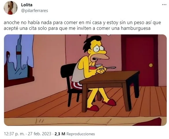 Todo comenzó cuando la usuaria ‘Lolita’ (@pilarferrares) comentó la decisión que había tomado el día anterior. "Anoche no había nada para comer en mi casa y estoy sin un peso", reveló la joven al comienzo de su publicación. Luego, agregó: "Así que acepté una cita solo para que me inviten a comer una hamburguesa".