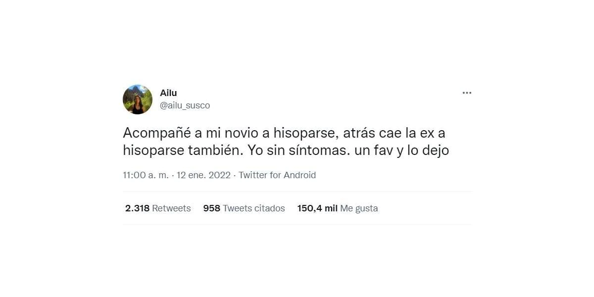 “Acompañé a mi novio a hisoparse, atrás cae la ex a hisoparse también. Yo sin síntomas. un fav y lo dejo” señaló la joven bajo el usuario de @ailu_susco. El mismo tuit alcanzó dos mil retuits y más de 150 mil ‘me gusta’, además de cientos de comentarios donde algunos se reían y otros se mostraban críticos sobre la situación.