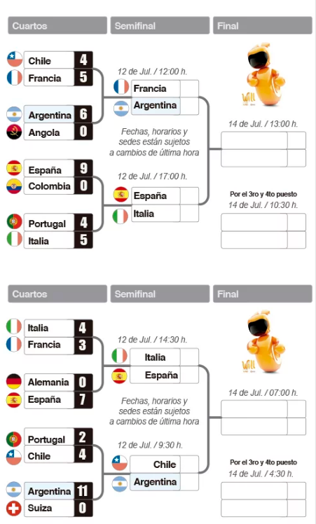 La Selección Argentina jugará la semifinal a las 12, frente a Francia. El combinado que dirige José Luis Páez viene de ganarle a Angola en los cuartos de final por 6-0 mientras que el equipo francés superó a Chile por 5-4.
