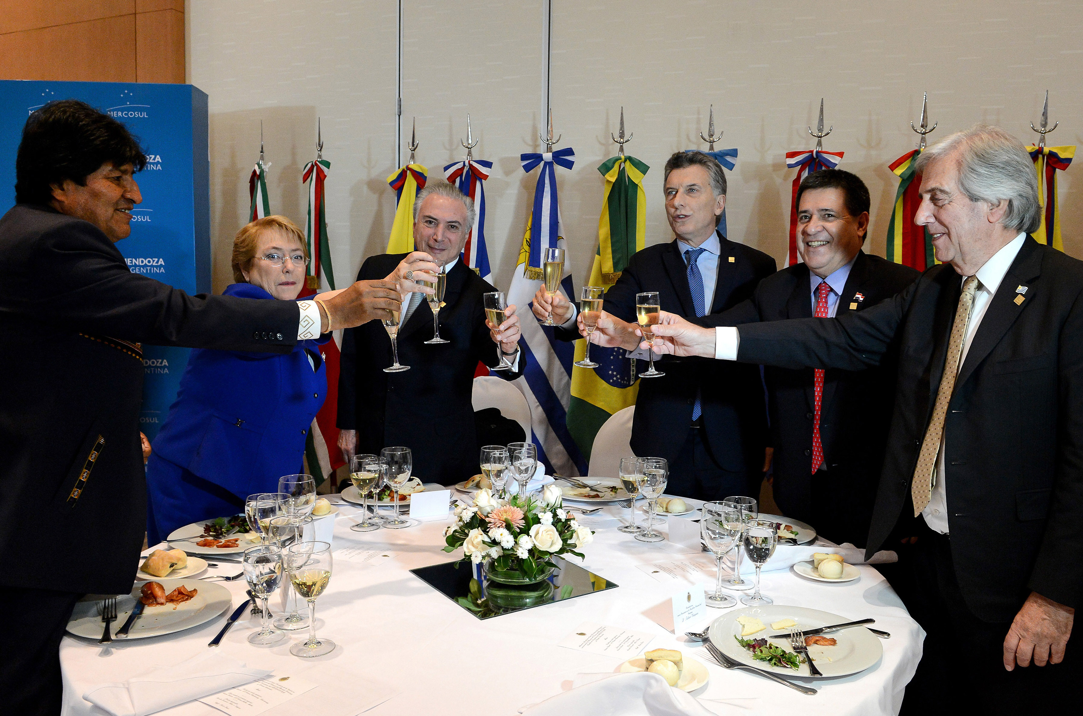 Brindis. Macri brindó con presidentes de la región en Mendoza, donde se realizó la cumbre del Mercosur que había arrancado el lunes pasado.