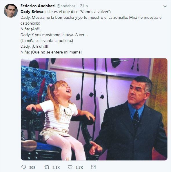 Sin embargo, el periodista no se quedó callado y apuntó nuevamente contra el humorista pero en esta ocasión, con una denuncia comprometedora. Andahazi lo acusó de pedófilo cuando llevaba a cabo el programa infantil Agrandadytos. "Dady debería hacerse cargo de cuando hace relativamente poco tiempo daba clases prácticas de pedofilia, pidiéndole a una nena de cinco años que le mostrara la bombachita ante miles de televidentes y cuando, la nena se resistió, le dijo ‘eso no se hace’, él le contestó ‘tu mami nunca se va a enterar’. Entonces, para darles ánimos, él le mostró el calzoncillo. Eso lo hizo en televisión, a una nena de cinco años", manifestó en el periodista en el ciclo radial de Alfredo Leuco, "Le Doy Mi Palabra".