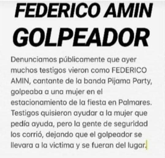 Diferentes usuarios de las redes sociales compartieron un cartel con información sobre una supuesta agresión que ocurrió en el salón Palmares, ubicado en Chimbas, por parte de Federico Amin, el cantante del conocido grupo de cumbia pop Pijama, hacia su novia Josefina Robins.