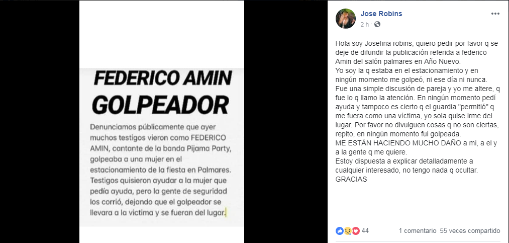 Este miércoles, la novia del cantante de la reconocida banda sanjuanina, Josefina Robins, utilizó su perfil para explicar lo que ella protagonizó, escrito que Amín compartió en su muro. "Quiero pedir por favor que se deje de difundir la publicación referida a Federico Amin del salón Palmares en Año Nuevo. Yo soy la que estaba en el estacionamiento y en ningún momento me golpeó, ni ese día ni nunca", resaltó.
