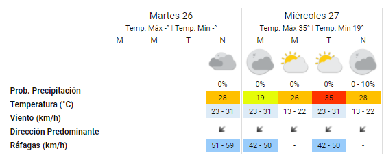 Su procedencia será del sector Noreste y las temperaturas volverán a ser bastante elevadas. La mínima pronosticada será de 19 grados y se aguarda una máxima de 35. Las ráfagas volverán a ser protagonistas del ambiente durante la tarde, con una velocidad estimada de hasta 50 kilómetros por hora.