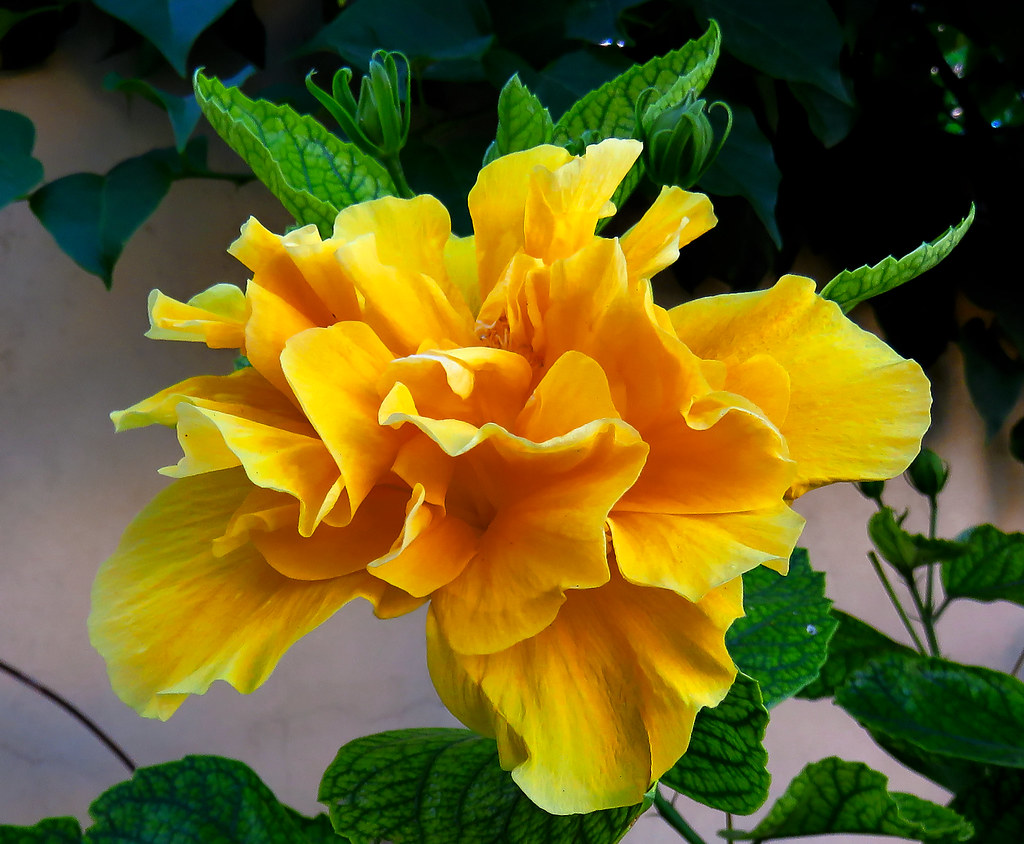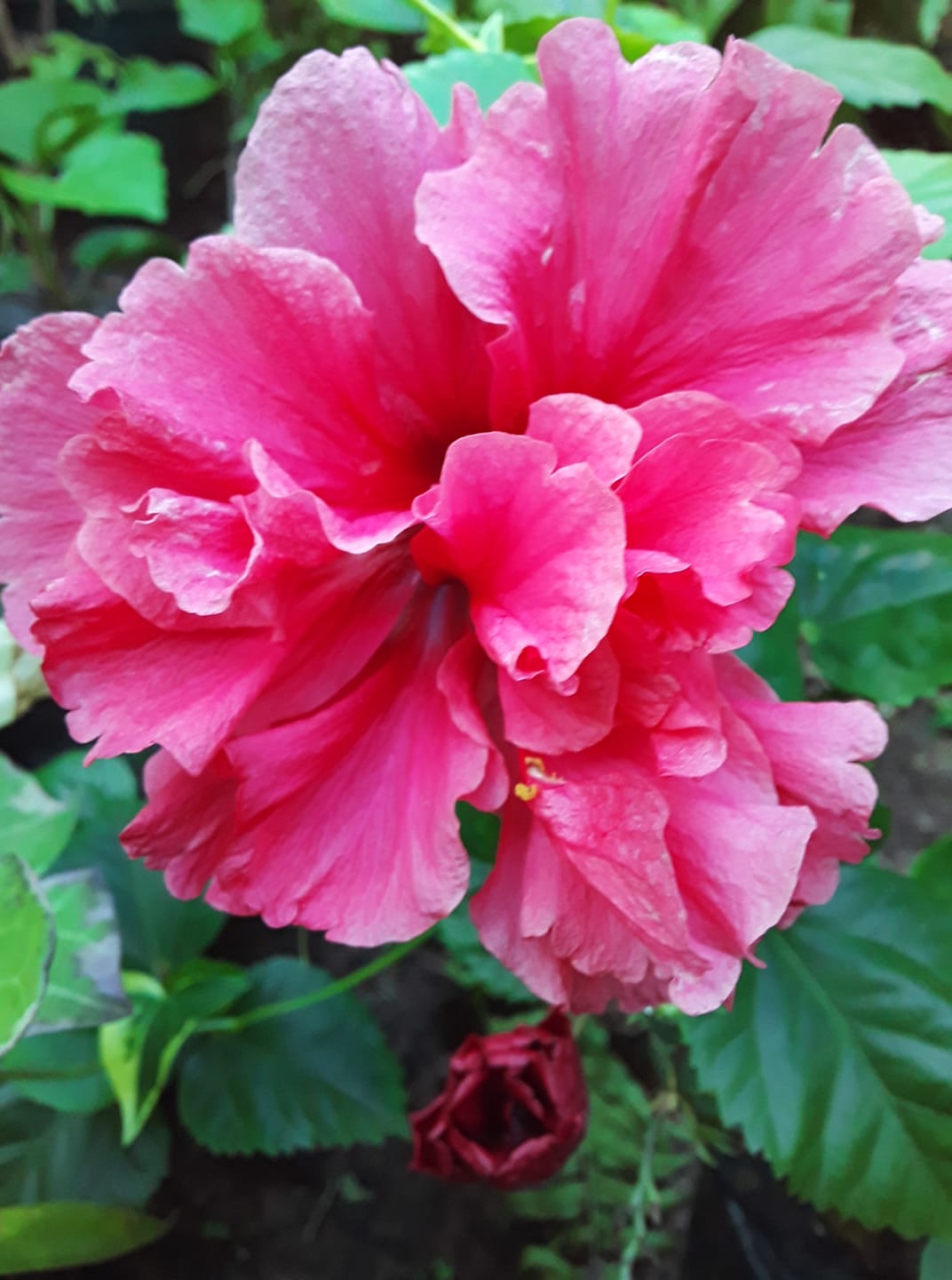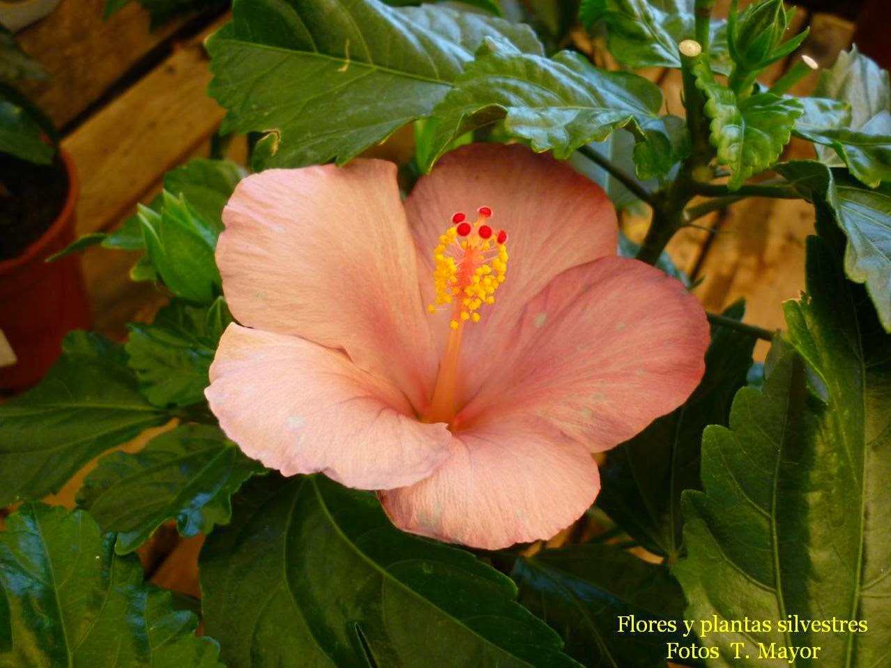 Es un arbusto compacto de hojas verdes brillantes y de floración impactante. Su nombre científico, Hibiscus rosa-sinensis, su nombre vulgar o común es Rosa China. Pertenece a la familia de las Malvaceae. De origen,China. Es una planta perennifolia, que puede llegar a una altura de 5m. Las hojas son alternas y ovaladas aunque pueden variar e incluso tener los bordes más o menos dentados, el color es verde oscuro y de aspecto brillante.