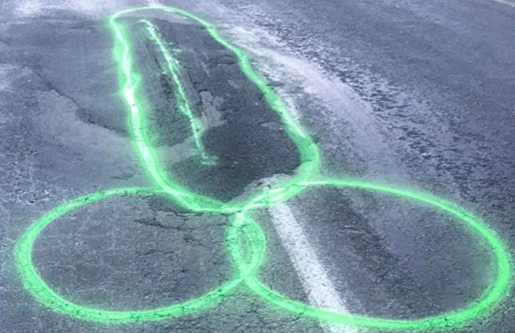Rodeando los pozos, el hombre marca con aerosol verde fluo la zona irregular del asfalto, pero en algunos casos va formando casi sin querer el dibujo de un pene. Esto sin dudas llamará la atención de los conductores, que evitarán pasar por allí y probablemente también eviten un accidente.