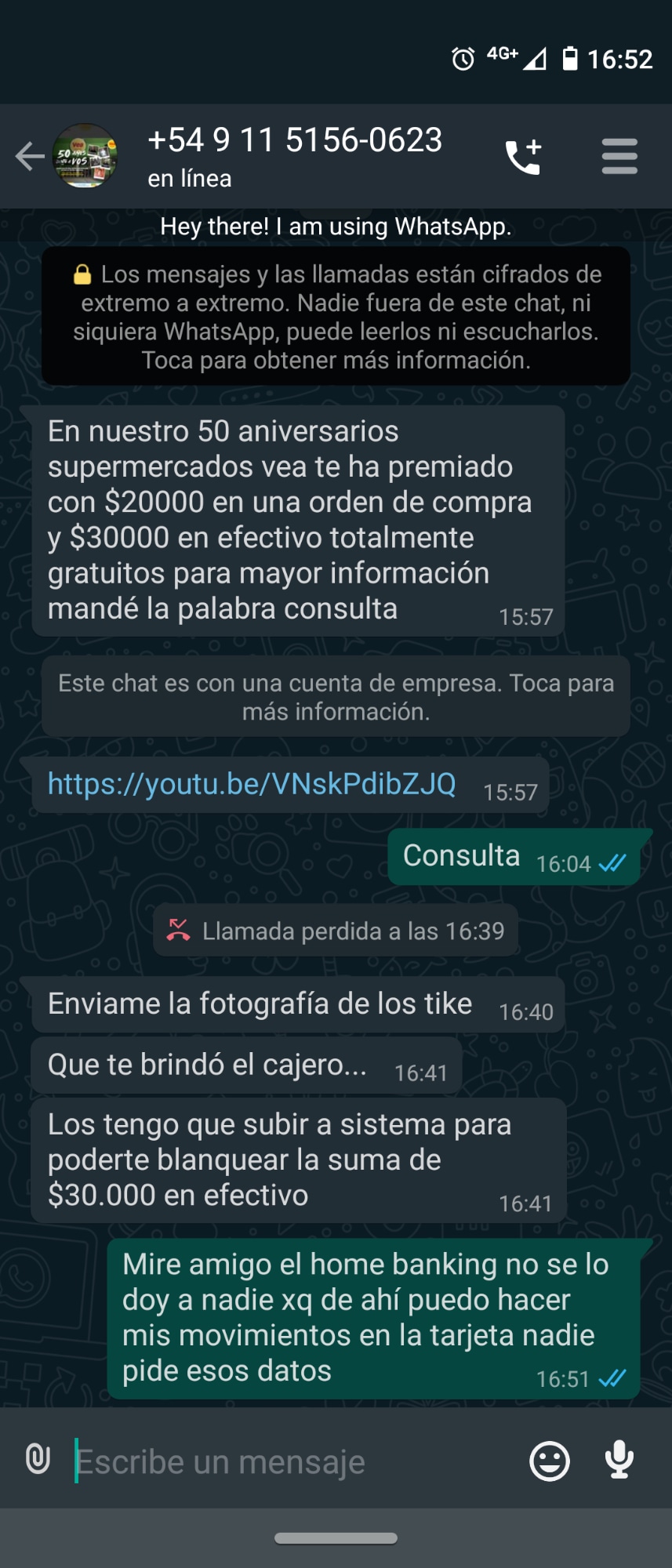 El hombre, que respondió a los mensajes del número con característica de Buenos Aires comenzó a recibir llamadas constantes y decidió comunicarse directamente con el supermercado. “Llamé al 0800 del VEA e inmediatamente me indicaron que no tenían ninguno de esos premios ni concursos en vigencia y que evidentemente se trataba de una posible estafa. También me recomendaron que evitara dar cualquier tipo de información personal”, comentó Carlos.