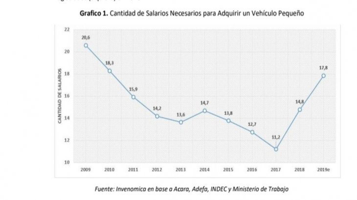 El salto de precios destruyó el poder adquisitivo de los salarios. Mientras en 2018 se necesitaban 14,8 sueldos promedio para adquirir un vehículo chico, a fines del 2019 se requirieron 17,8 salarios. Esto se desprende de un informe realizado por la consultora Invenómica para la asociación que agrupa a las concesionarias de autos (ACARA).