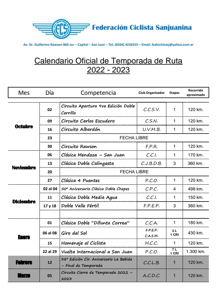 Con la temporada a punto de terminar, la Federación Ciclista Sanjuanina (FCS) anunció novedades en su calendario de ruta. La noticia es que sumará una competencia más en el epílogo del cronograma.