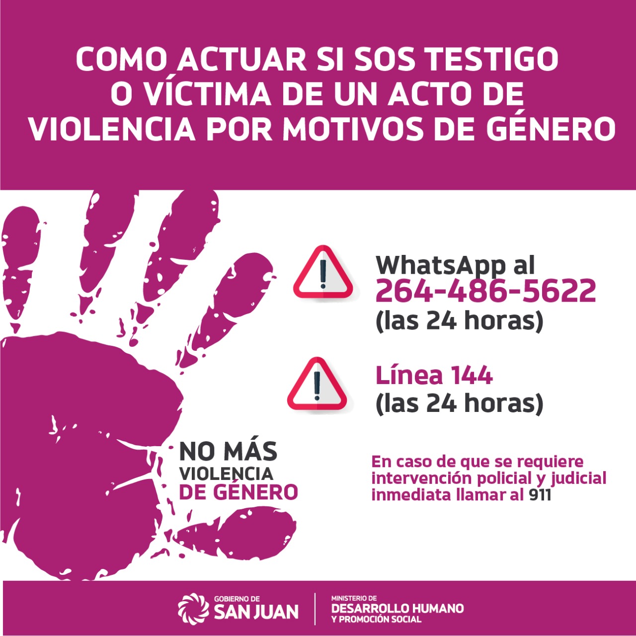 Desde el fin de semana pasado, un caso de violencia de género que fue filmado por testigos en medio de un bar, genera estupor en la sociedad sanjuanina. Ahora, en medio de la repercusión del caso, desde el Ministerio de Desarrollo Humano enviaron un comunicado recordando qué hacer en caso de ser testigo o víctima de un hecho de este tipo. "Si ves que agreden a una mujer o alguien del colectivo de la diversidad, escuchas insultos o presencias cómo la atacan, no mires hacia otro lado", pidieron.