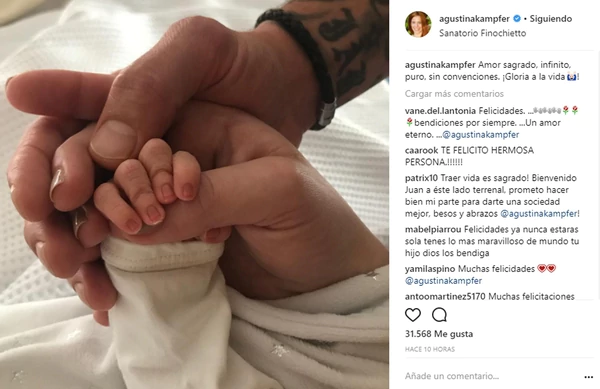 "Amor sagrado, infinito, puro, sin convenciones. ¡Gloria a la vida!", escribió la flamante mamá junto a una imagen donde se puede observar la pequeña mano del recién nacido, entrelazada con la de ella y el papá.