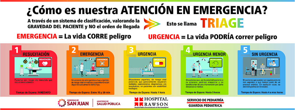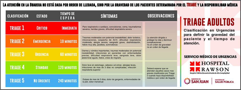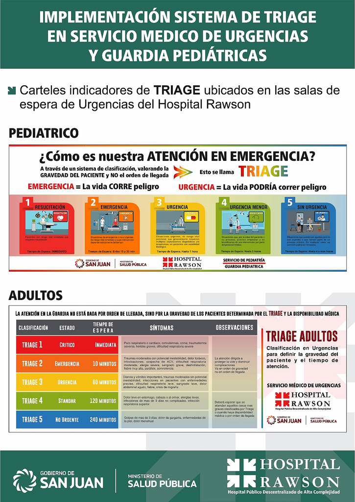 La atención de las Guardias de Urgencias Adultos y Pediátricos del Hospital Rawson se regirá por el Sistema Internacional de Triage, en el cual la atención está dada por la gravedad de los pacientes ingresantes y la disponibilidad médica del servicio, y no por el orden de llegada, informaron desde el nosocomio capitalino.