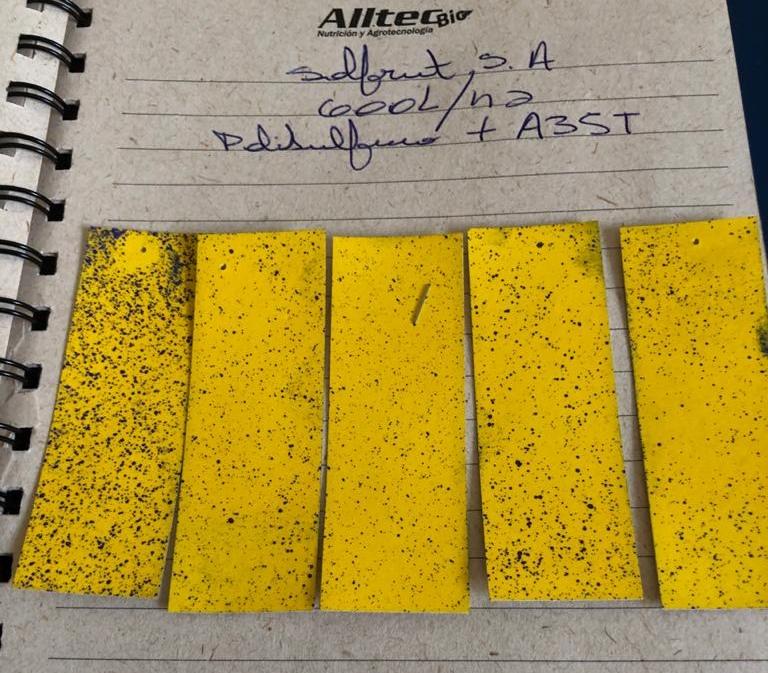 Partiendo de la base que "no hay dos aplicaciones iguales en el cultivo", y que cada hora en el campo cuesta, las aplicaciones son estudiadas cada vez más. Y en ello incide el tamaño de las gotas. Este último al momento de utilizar fitosanitarios es la clave para una aplicación eficiente y sin derivas. El principal objetivo al momento de pulverizar es que el producto llegue al blanco, sin afectar a la sociedad ni al ambiente. Es por esto que, el uso de distintos coadyuvantes resulta imprescindible al momento de realizar aplicaciones. El primer paso para un control eficiente es conocer bien la plaga a la cual nos enfrentamos y elegir el producto correcto a utilizar. El tamaño de gotas y la cobertura de las mismas (número de gotas por centímetro cuadrado), son dos de los principales parámetros que se deberán verificar al momento de realizar una aplicación con productos fitosanitarios. Nos brindan información para saber si la aplicación resultó eficaz, sin generar inconvenientes por deriva. La tarjeta hidrosensible es una herramienta fundamental para poder lograr aplicaciones eficientes y responsables. Este material es un papel, de color amarillo, muy sensible a la humedad. Al entrar en contacto con una gota de agua o líquido, se mancha de color azul, revelando el lugar donde ha caído la gota. Su uso es fundamental al momento de realizar una aplicación por dos motivos. Uno, permite evaluar la calibración de la máquina. Y dos, comprobar la calidad de la aplicación realizada. Las tarjetas hidrosensibles evalúan la distribución de gotas, tamaño de las mismas y permiten verificar que no se hayan generado derivas. Pueden utilizarse tanto en aplicaciones aéreas como terrestres. Se recomienda colocar tarjetas hidrosensibles en lugares al azar. Tanto en la parte superior, media e inferior del cultivo.