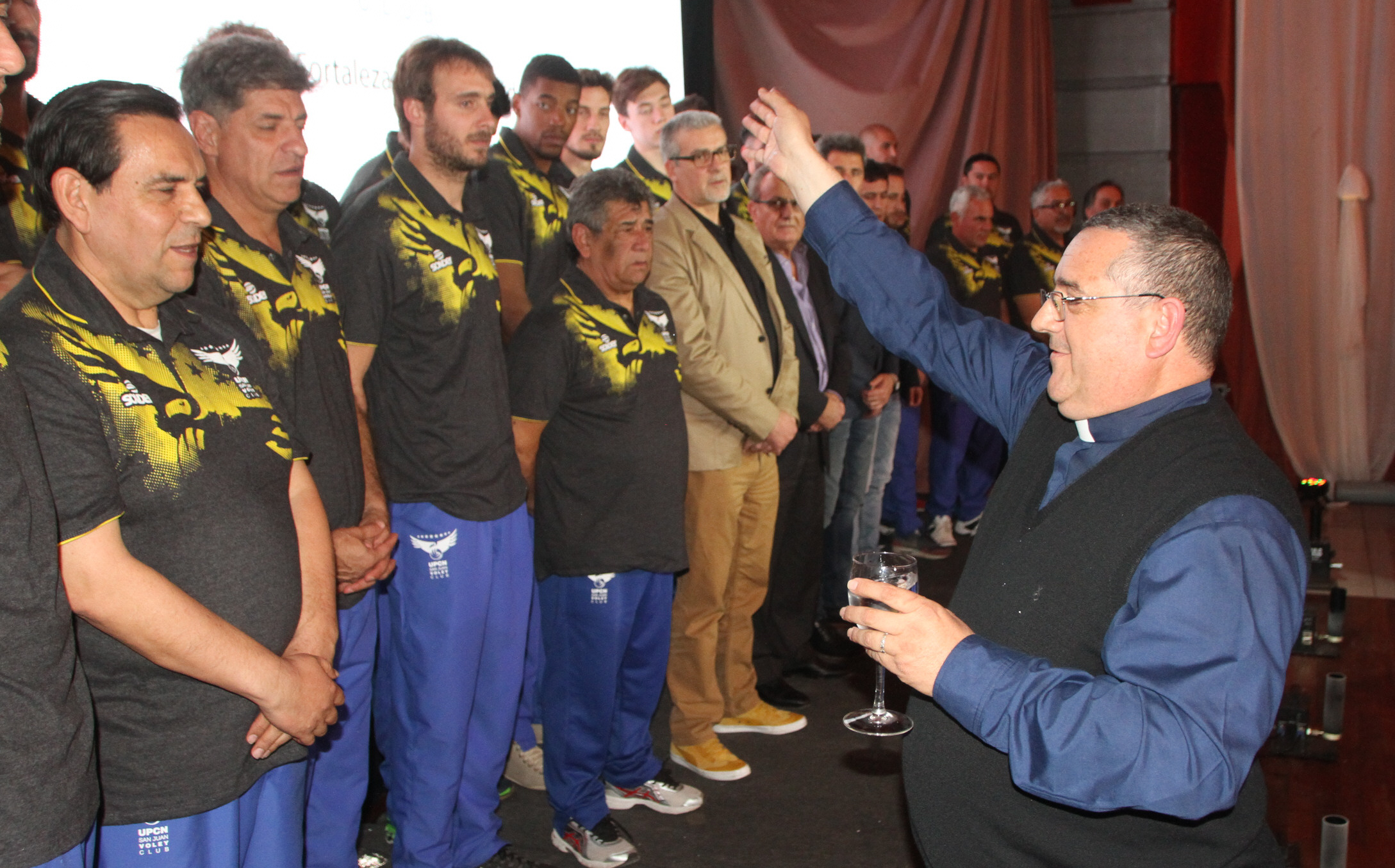 Bendición. El sacerdote Ricardo Doña bendijo, como habitualmente lo ha hecho, a los integrantes del equipo.