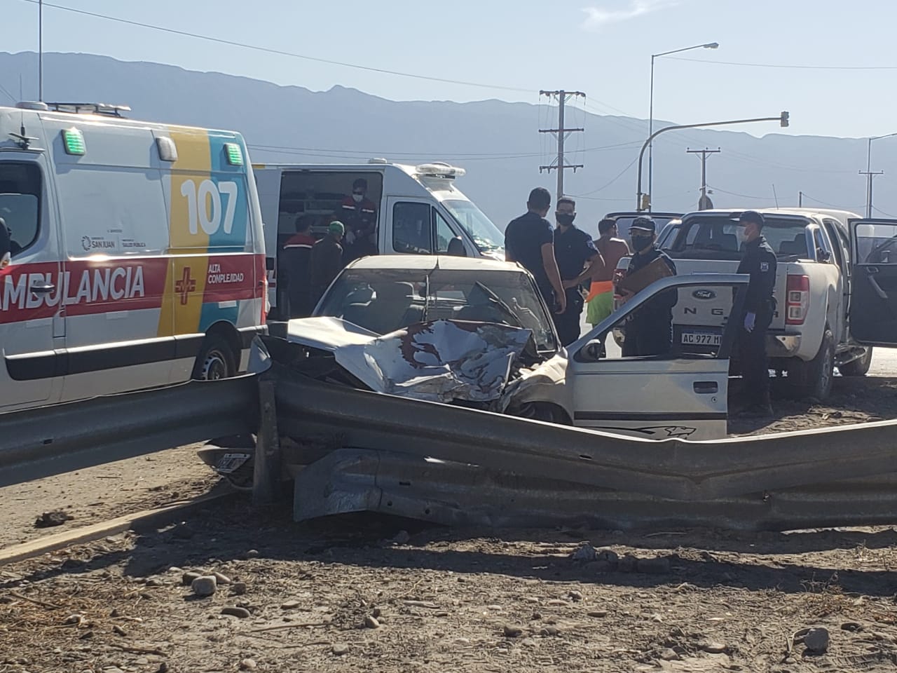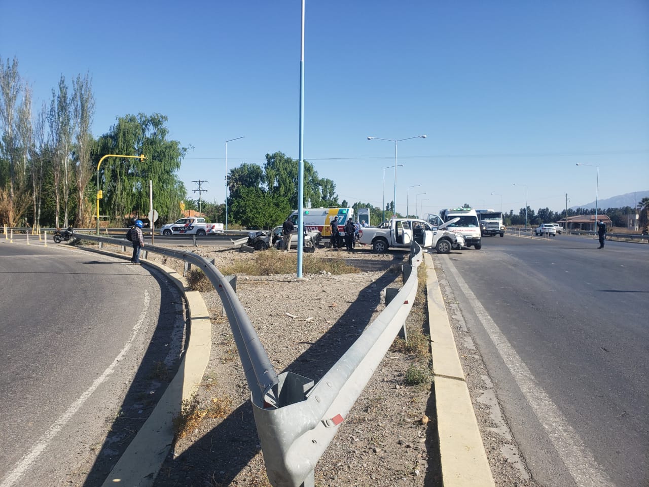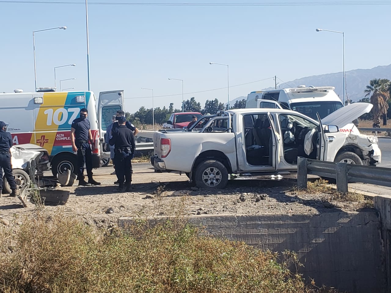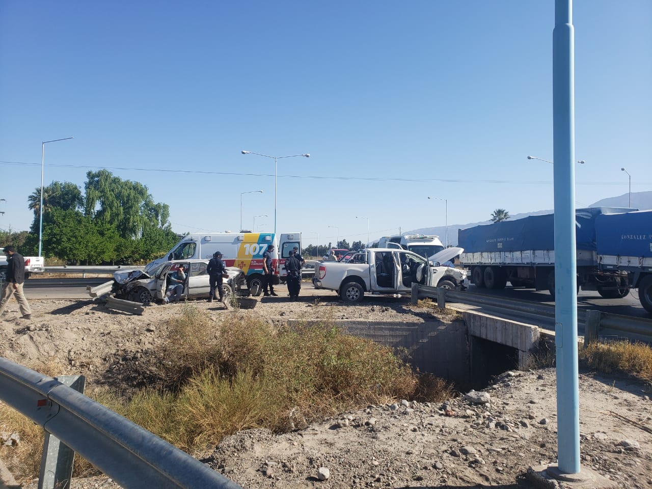 Hasta el momento se desconoce en que dirección circulaba cada vehículo, aunque en las imágenes se puede observar que el auto rompió un guardrail tras el choque y terminó en la banquina.