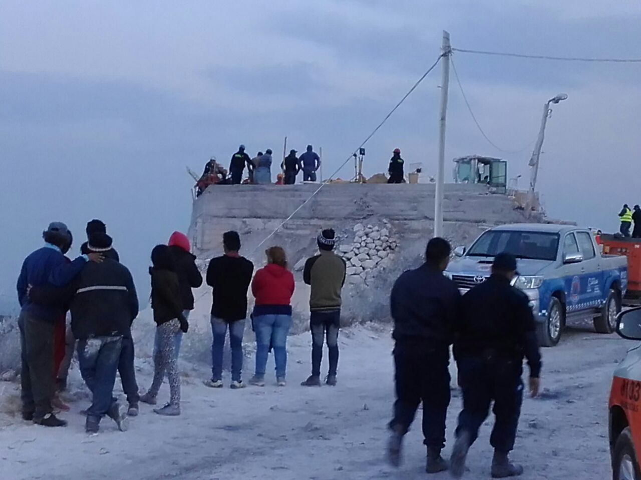 Bomberos de Rawson, la Policía de Los Berros y gente de Protección Civil trabajan incansablemente para sacar los cuerpos de los dos operarios que fallecieron después de que se derrumbara el horno de cal en el que trabajaban, que forma parte de la calera Serrano, ubicada en Callejón Minero, en Los Berros (Sarmiento).
