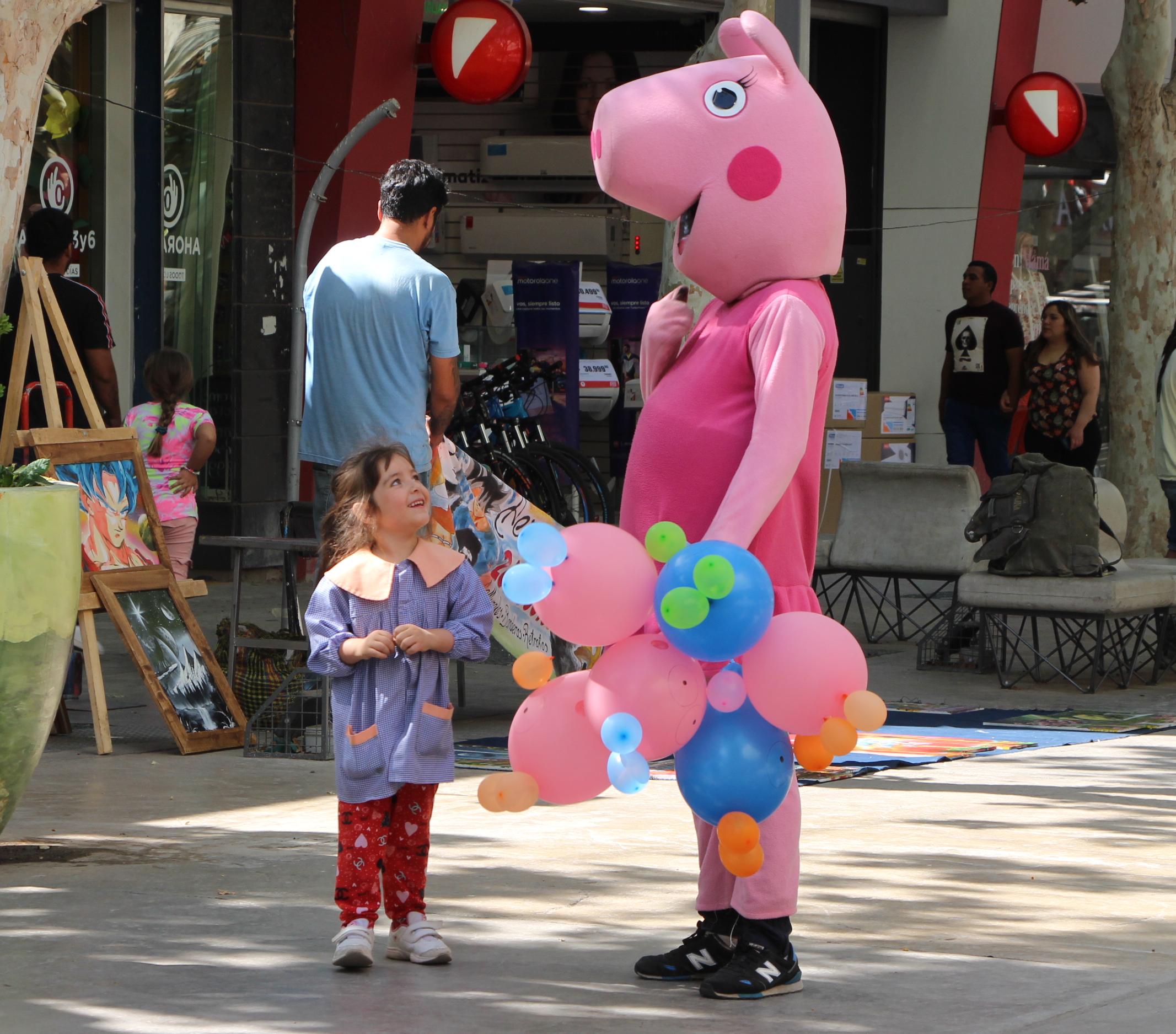 Con poco más de dos metros de altura, su rosa furioso y un puñado de globos en la mano, la figura de Peppa Pig ya forma parte del paisaje urbano de la Peatonal. Se ubica todos los días en el mismo lugar, sobre calle Tucumán cerca de Laprida. Debajo de esa mole de peluche está Sergio Escudero, de 41 años, a quien los más chicos se acercan casi obnubilados. Y es que en su imagen la ven a ella, la cerdita más famosa de la tele que tanto los divierte. Con toda la inocencia del mundo, se arriman de a poquito con los ojos brillantes y le dan un abrazo enorme.