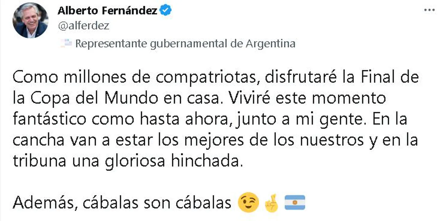 Los rumores sobre una posible presencia del mandatario en el partido en el que el conjunto dirigido por Lionel Scaloni buscará el tercer título del mundo para el país se habían incrementado el jueves. Ese día, la vocera de la Presidencia Gabriela Cerruti dijo que no había “una decisión tomada”.