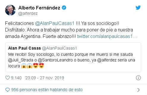 Los usuarios de la red social aprovecharon también para hacerle preguntar personales y sobre su futuro gobierno, y como corresponde publicaron memes alusivos al evento. "Me recibi! Soy sociólogo, lo cuento porque me muero si me saluda Julia Strada o Leandro Santoro o bueno, ya Alberto Fernández sería una locura", publicó un joven tímidamente, sin imaginar que la respuesta del presidente electo llegaría horas más tarde. "Felicitaciones!!! Ya sos sociólogo!! Disfrútalo. Ahora a trabajar mucho para poner de pie a nuestra amada Argentina. Fuerte abrazo!!!", contestó el líder del Frente de Todos. Así se desató una ola de preguntas y respuestas que se mantuvo hasta la madrugada.