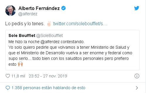 En su mayoría, las publicaciones fueron de estudiantes a punto de rendir o recién recibidos que reclamaban el saludo de Fernández. Pero también estuvieron los que pedían saludos de cumpleaños y los que preguntaron por sus mascotas y por las políticas que implementará en su gestión. "Me hizo la noche Alberto contestando. Yo solo quiero pedirle que volvamos a tener Ministerio de Salud y que el Ministerio de Desarrollo vuelva a ser enorme y federal como supo serlo… todo bien con los saluditos personales pero prefiero esto", reclamó un joven. "Lo pedis y lo tenes", le respondió.