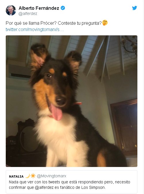 "Necesito confirmar si Alberto es fanático de Los Simpsons", preguntó otro, y Fernández respondió con una foto de su nuevo perro: "¿Por qué se llama Prócer? Conteste tu pregunta?". Se trata de una de las crías de Dylan, que es de la misma raza y lleva el mismo nombre que una de las mascotas de Bart Simpson.