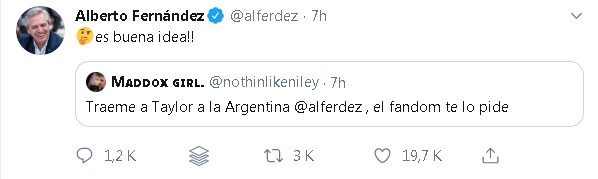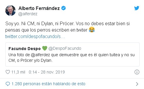 Una persona preguntó si realmente era Fernández el que respondía los mensajes, si su cuenta (@alferdez) estaba a cargo de algún community manager que le maneja las redes, o incluso alguna de sus mascotas. La respuesta fue contundente: "Soy yo. Ni CM, ni Dylan, ni Prócer. Vos no debes estar bien si pensás que los perros escriben en twitter".