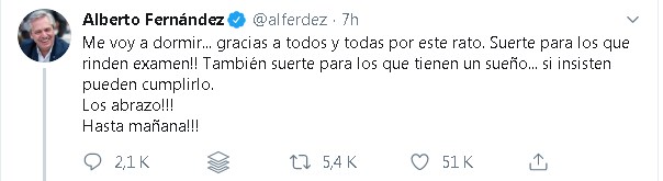 Alberto Fernández tiene una agenda agitada en los últimos días antes de asumir la presidencia. Mientras define su gabinete, el presidente electo se reunió este miércoles 27 de noviembre con su antecesor Eduardo Duhalde y cuestionó al Gobierno de Mauricio Macri por sus políticas en materia de Salud. A pesar de la agenda cargada, el exjefe de Gabinete pudo dedicar una noche a responderle a sus seguidores de Twitter, en su mayoría estudiantes a punto de rendir finales que pedían un saludo de "buena suerte".