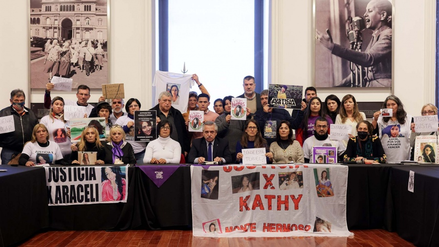 Participaron del encuentro, que se desarrolló en el Salón de las Mujeres de la Casa Rosada, Marta Montero, mamá de Lucía Pérez; Mónica Ferreyra y Ricardo Fulles, padres de Araceli Fulles; Alfredo Barrera, papá de Carla Soggiu; Alberto Basaldúa y Dora Reyes, padres de Cecilia Basaldúa; Blanca Ozan, mamá de Agustina Fredes; y César Ezequiel Moscoso y Wanda Banegas, familiares de Katherine Moscoso.