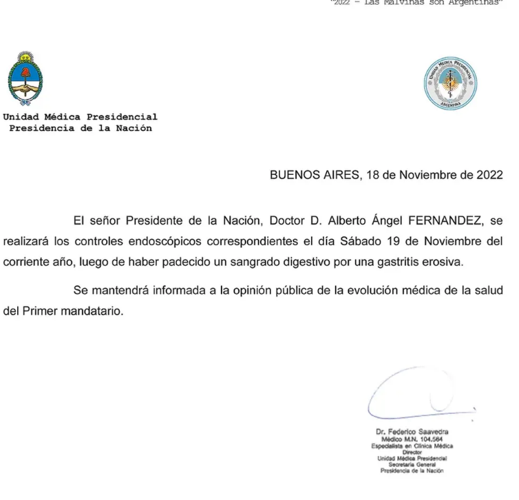 En un comunicado de la Unidad Médica Presidencial, firmado por su titular Federico Saavedra, se precisó que el Presidente será sometido a “controles endoscópicos” luego de “haber padecido un sangrado digestivo por una gastritis erosiva”. La Unidad Médica se comprometió a mantener “informada a la opinión pública de la evolución de la salud del primer mandatario”.