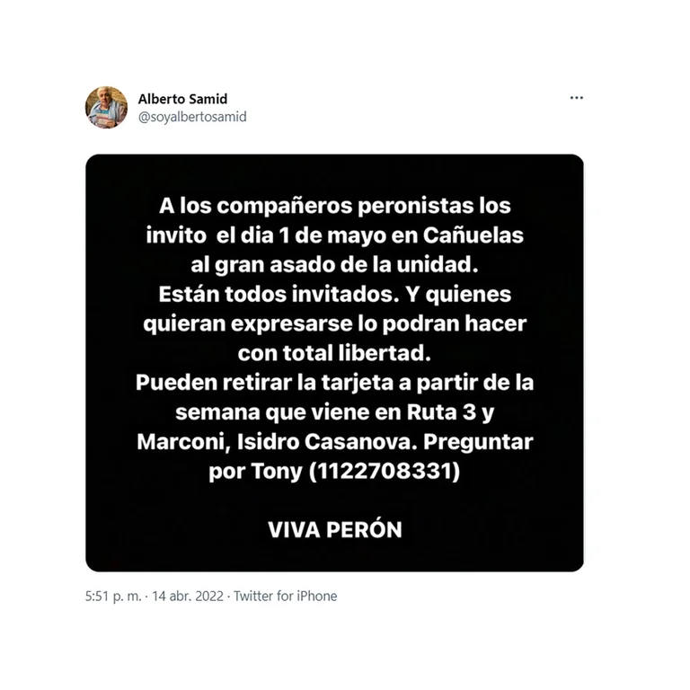 Con el goce de ese nuevo beneficio, lo primero que hizo Samid fue convocar a un “asado militante” desde su cuenta personal de Twitter.