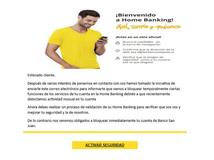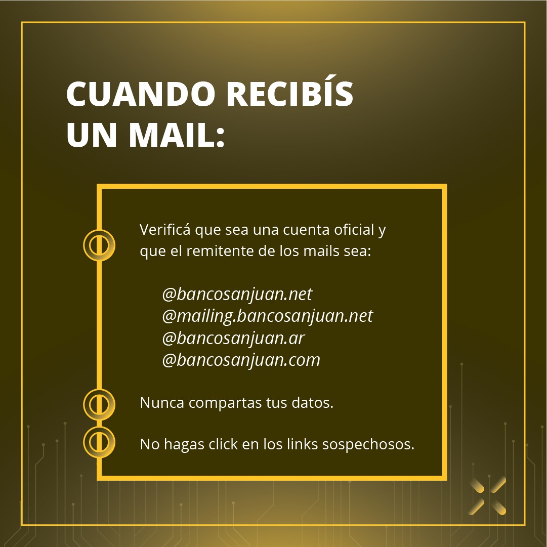 En los últimos días, gran cantidad de sanjuaninos recibieron mails que decían ser del Banco San Juan, a través de los cuales se solicitaba activar medidas de seguridad con el objetivo de evitar robos. Justamente, esos mensajes resultaron ser una estafa y, cuando los clientes ingresaron sus datos, sufrieron robos de sus cuentas. Ante esta situación, desde la entidad recordaron las medidas a tener en cuenta para evitar este tipo de estafas conocidas como phishing.