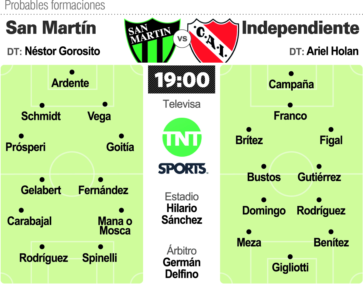 San Martín, que viene de caer 4-2 ante el puntero Boca en La Bombonera, tendrá varios cambios. Salen los defensores Matías Escudero (llegó a la 5ta amarilla) y Luis Olivera (distensión en el isquiotibial), más el volante Nicolás Pelaitay (táctico), para los ingresos de Damián Schmidt, Yonatan Goitía y Maximiliano Rodríguez respectivamente.