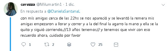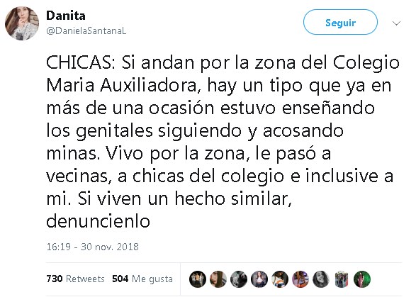 En las últimas horas, una joven denunció en su cuenta de Twitter la presencia de un depravado, que muestra sus genitales y acosa mujeres en las inmediaciones del Colegio María Auxiliadora. El mensaje tuvo una gran repercusión en las redes y varias jóvenes se animaron a contar sus desagradables experiencias con el depravado en cuestión. Todo con el objetivo de alertar a otras mujeres para que tengan cuidado si circulan por la zona.