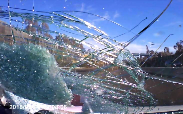 Una mujer australiana ha difundido a través de Facebook aterradoras imágenes registradas por la cámara de su coche, que muestran el momento en que un objeto metálico sale despedido de un camión e impacta contra el parabrisas de su automóvil.
