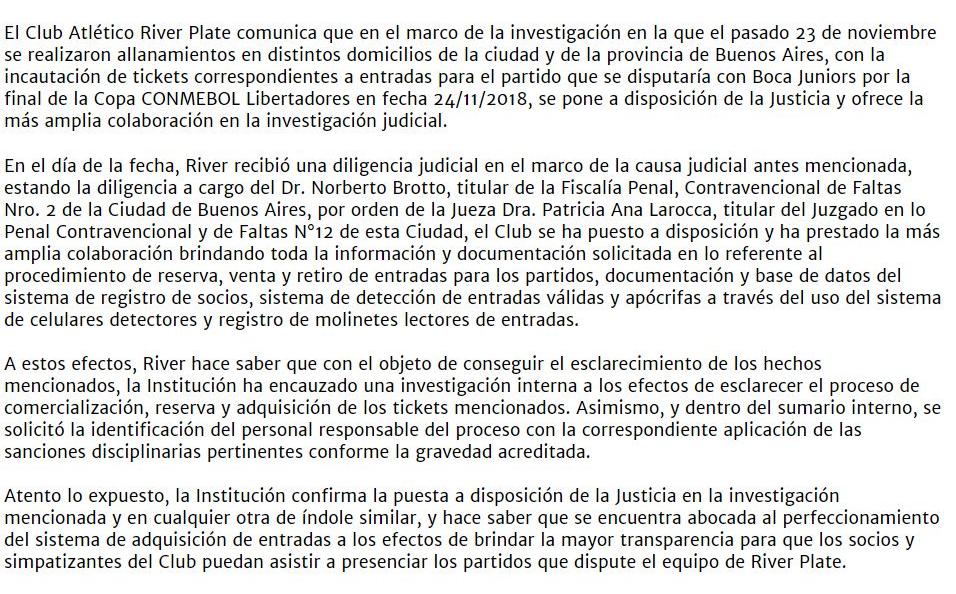 En ese sentido, el club emitió un comunicado en el que aseguró que está a disposición de la Justicia. "River recibió una diligencia judicial a cargo del Dr. Norberto Brotto, titular de la Fiscalía Penal, Contravencional de Faltas Nro. 2 de la Ciudad de Buenos Aires, por orden de la Jueza Dra. Patricia Ana Larocca, titular del Juzgado en lo Penal Contravencional y de Faltas N°12 de esta Ciudad, el Club se ha puesto a disposición y ha prestado la más amplia colaboración brindando toda la información y documentación solicitada en lo referente al procedimiento de reserva, venta y retiro de entradas para los partidos, documentación y base de datos del sistema de registro de socios, sistema de detección de entradas válidas y apócrifas a través del uso del sistema de celulares detectores y registro de molinetes lectores de entradas", consignó el parte de prensa. El club también aseguró que inició "una investigación interna".