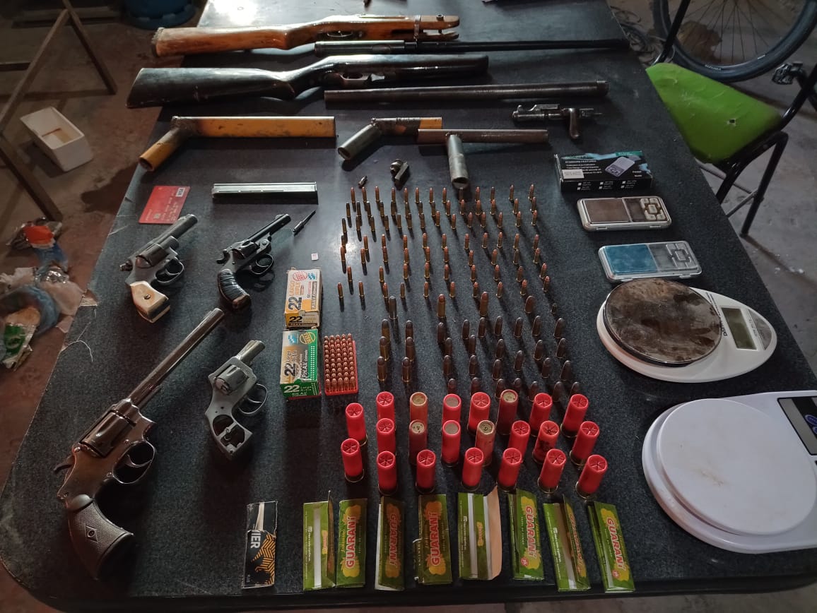 Allí, por orden del Segundo Juzgado Correccional, realizaron allanamientos en cuatro domicilios en uno de ellos encontraron un revólver calibre 38 mm, 2 revólveres calibre 22 mm, un revólver calibre 22 mm, una carabina calibre 22 mm y una escopeta desarmada. Además de, 160 municiones de distintos calibres y tres armas de fabricación casera. Sumado a eso, se halló 8 papeles lillo para armado de cigarrillo y 4 balanzas de precisión, que fueron secuestrados.