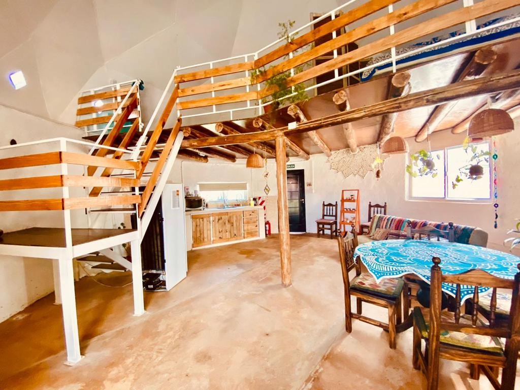 Todo comenzó cuando Luis, Mariana y la familia perruna construyeron su casa con forma de domo entre el 2017 y el 2018. Hace 1 año y 2 meses tuvieron que hacerle lugar a su hija Almendra. "Desde que nos conocimos teníamos en claro que íbamos a hacer una construcción alternativa. No llevamos una vida radicalmente ecológica, si respetamos mucho los animales, la naturaleza y queríamos una construcción que saliera de lo común pero que a su vez no impactara tanto en el espacio donde vivimos, queríamos algo lo más sostenible y sustentable posible. De paso, este tipo de viviendas resultan más económicas (el ahorro se calcula hasta un 60% en relación con las viviendas tradicionales) y son más eficientes energéticamente hablando. Son sismorresistentes. La prueba de fuego la pasamos en el último terremoto que no sufrimos ni un daño pese a estar en el epicentro. Por eso, turista que viene, sea sanjuanino, de cualquier punto del país, e inclusive del plantea porque recibimos mucha gente de afuera, intentamos que viva la experiencia de tener una rutina en un lugar diferente”, invita a su alojamiento este fanático de la naturaleza que convive entre su profesión de abogado y su nuevo desafío emprendedor.